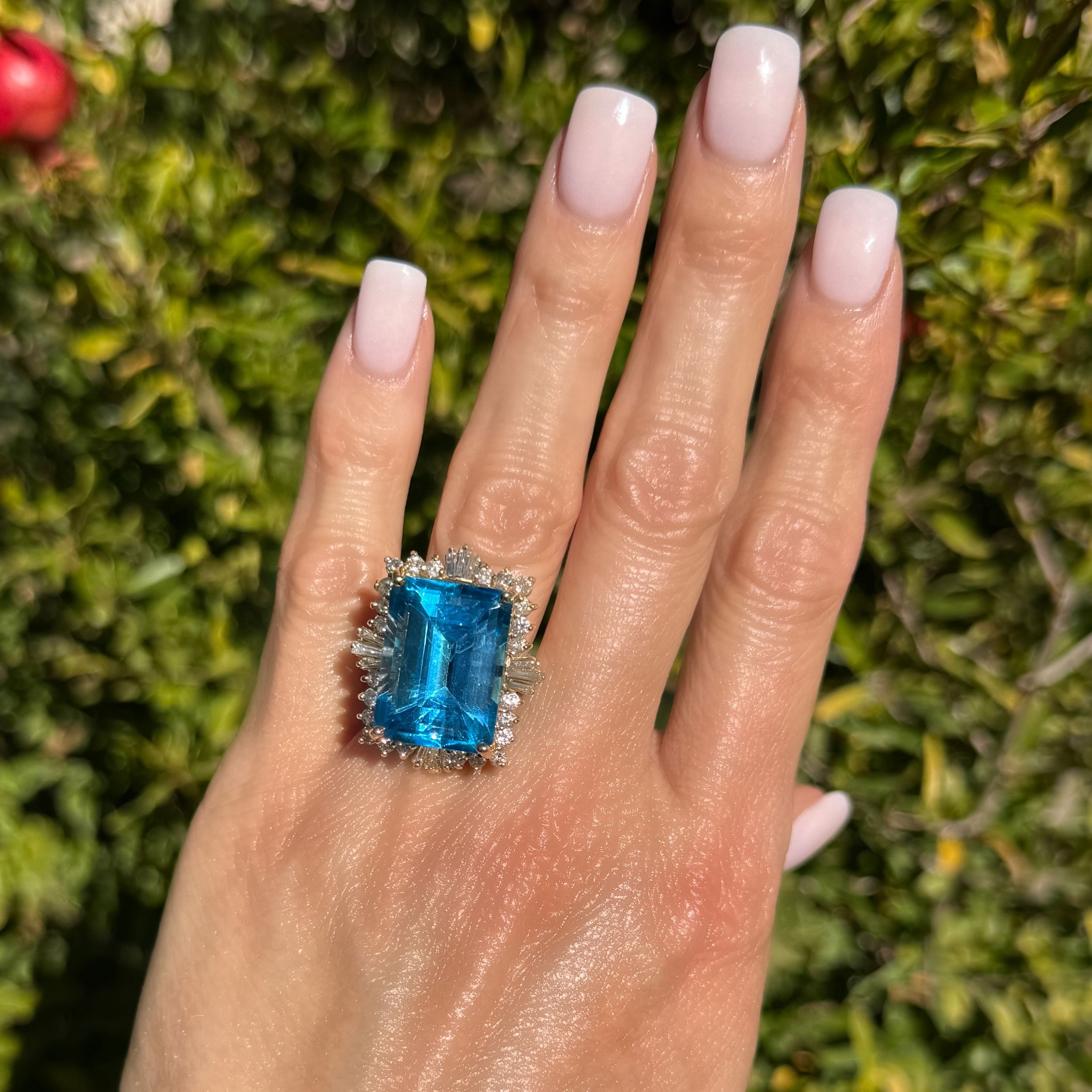 14K YG 20ct Emerald Cut Blue Topaz & 1.10tcw Diamond Ring 16.4g, s8 | Platinum 1911