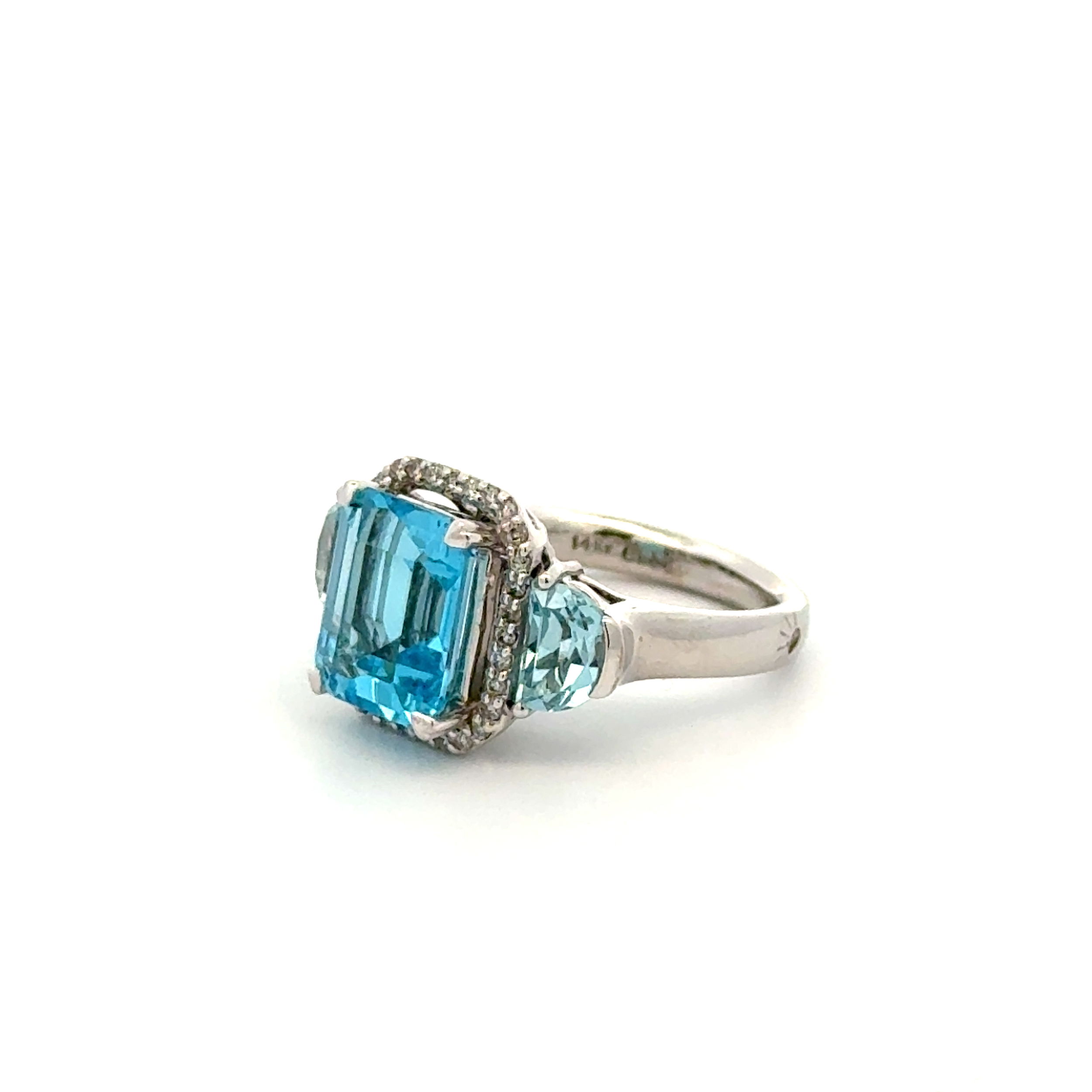 - 14K WG 3ct Emerald Cut Blue Topaz, .70tcw Topaz & .16tcw Diamond Ring 6.4g, s5.5