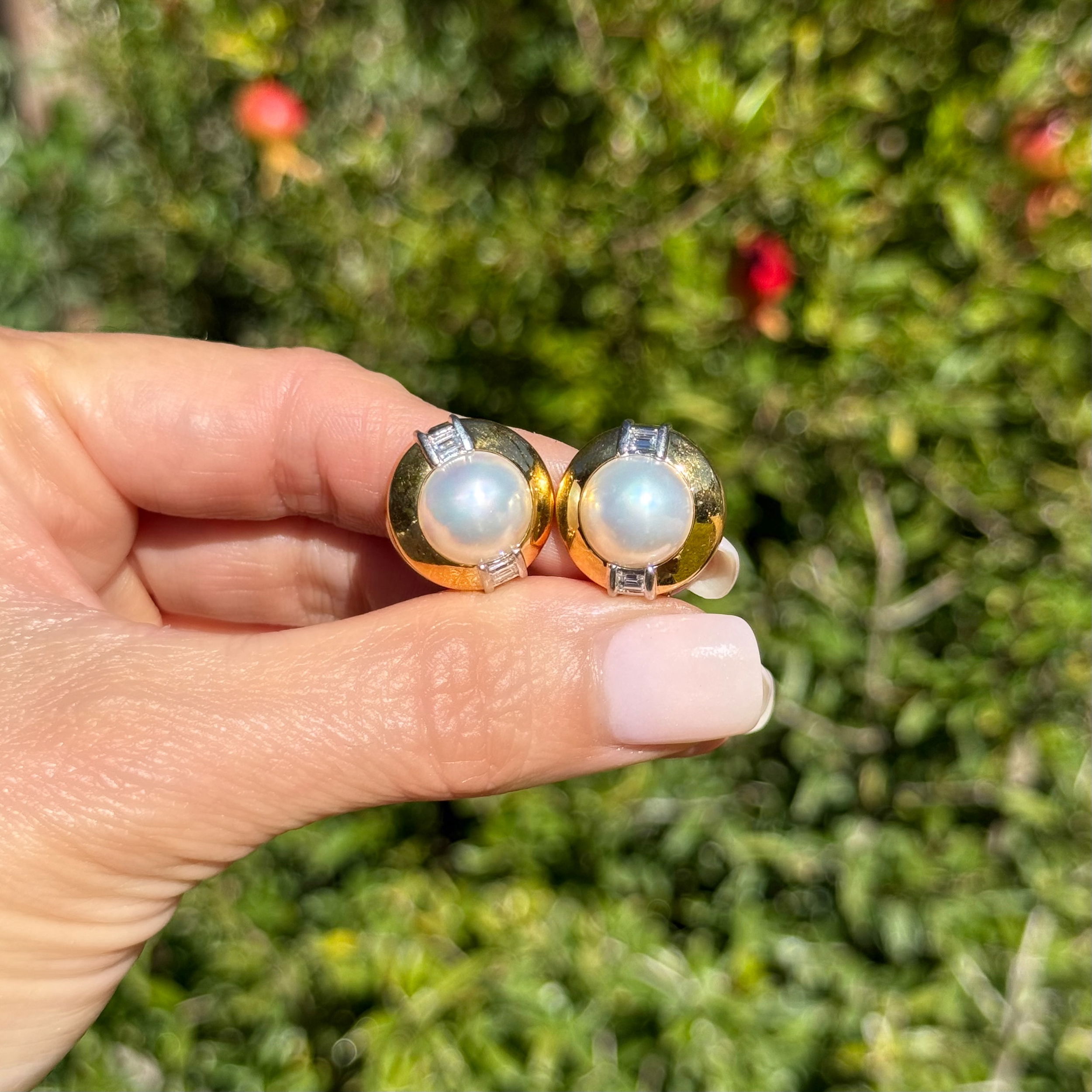 18K YG Mabe Pearl & .20tcw Emerald Cut Diamond French Clip Earrings 10.7g, 15.70mm