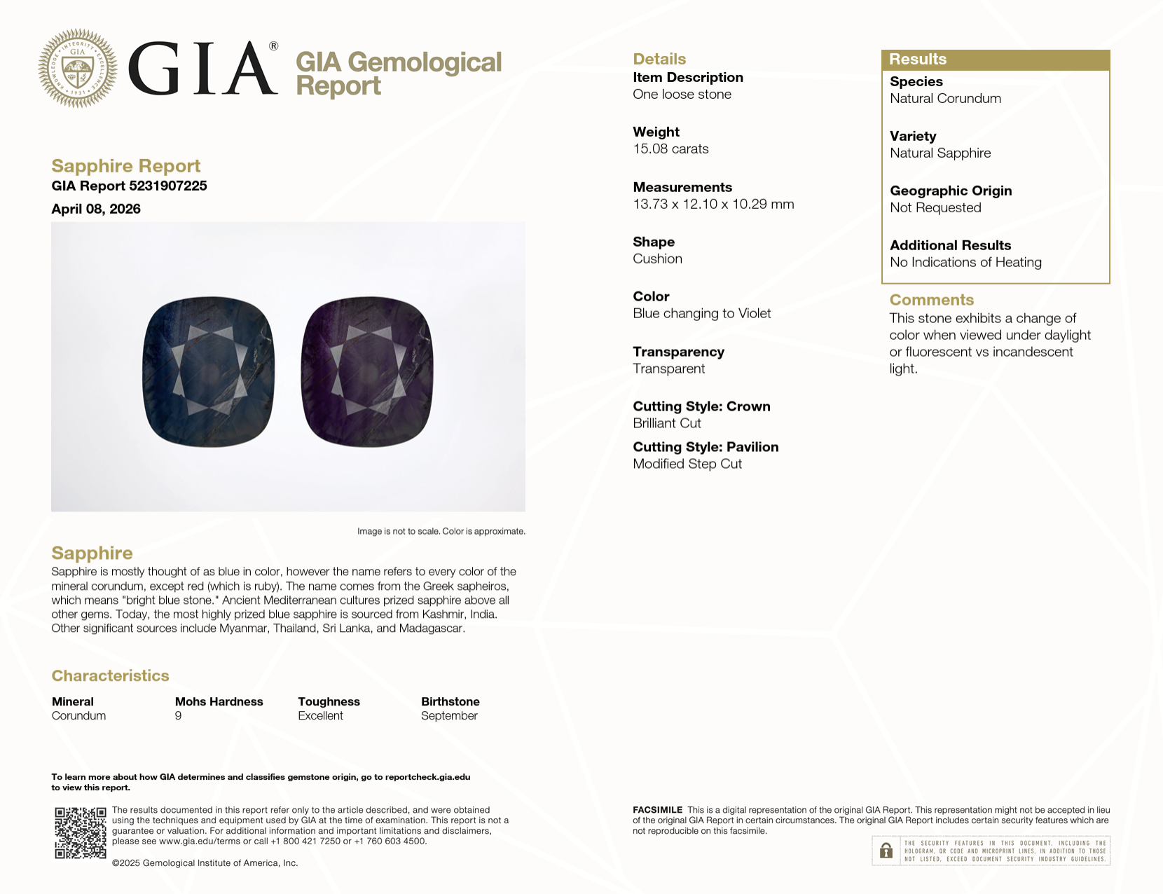 - 15.08ct Cushion Color Change Sapphire GIA NO HEAT Blue to Violet 5231907225