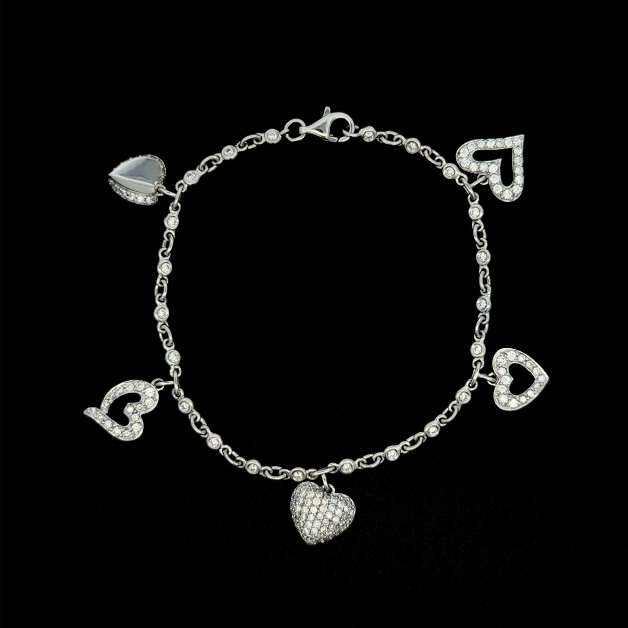 - 18K WG 1.32tcw RBC Diamond 5 Heart Station Charm Bracelet 9.8g, 7"