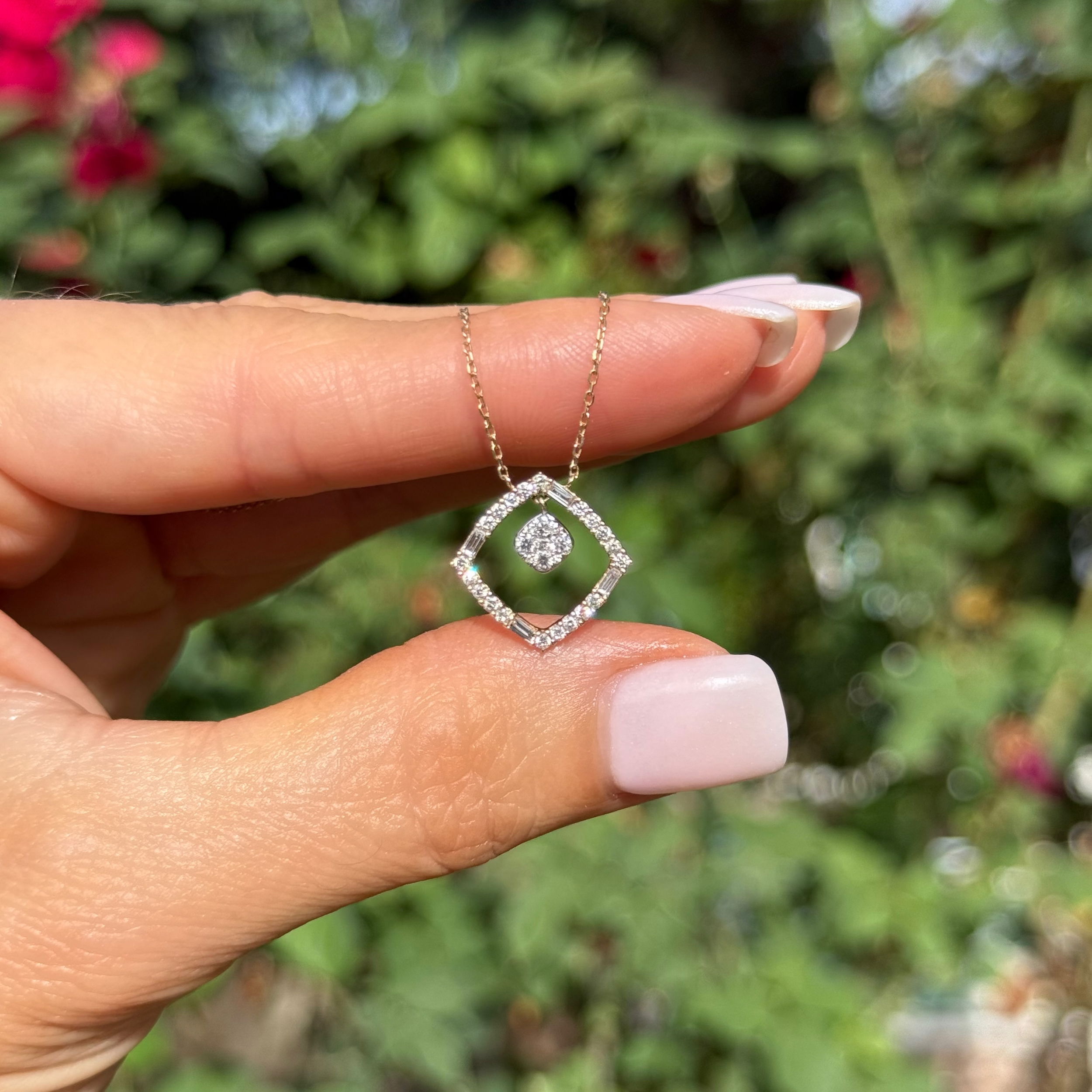- 14K YG Petite Open Square .40tcw Baguette & RBC Diamond Pendant Necklace 2.0g, 18"