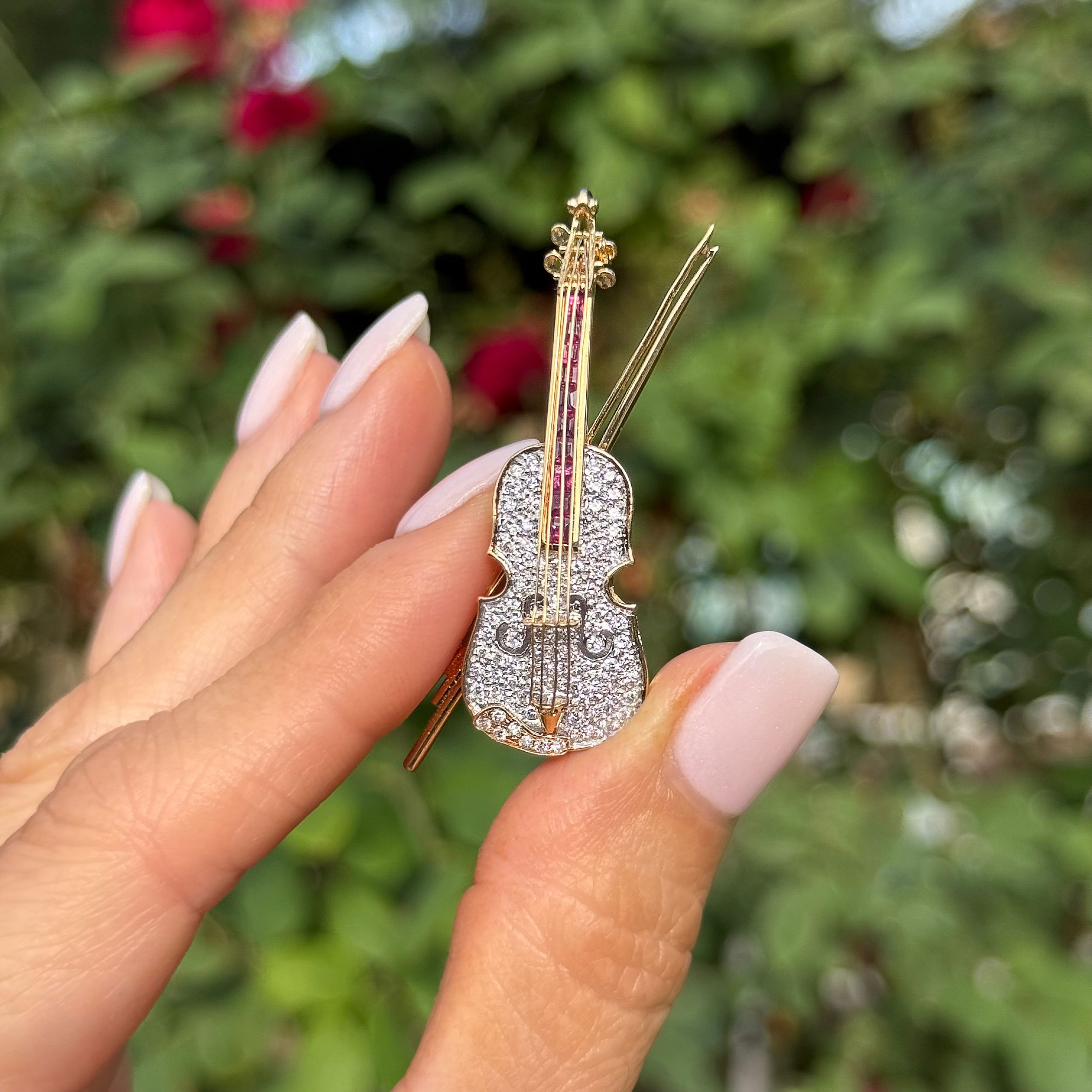 - 18K YG Violin .50tcw Ruby & .60tcw Diamond Brooch Pendant 10.9g, 1.65"