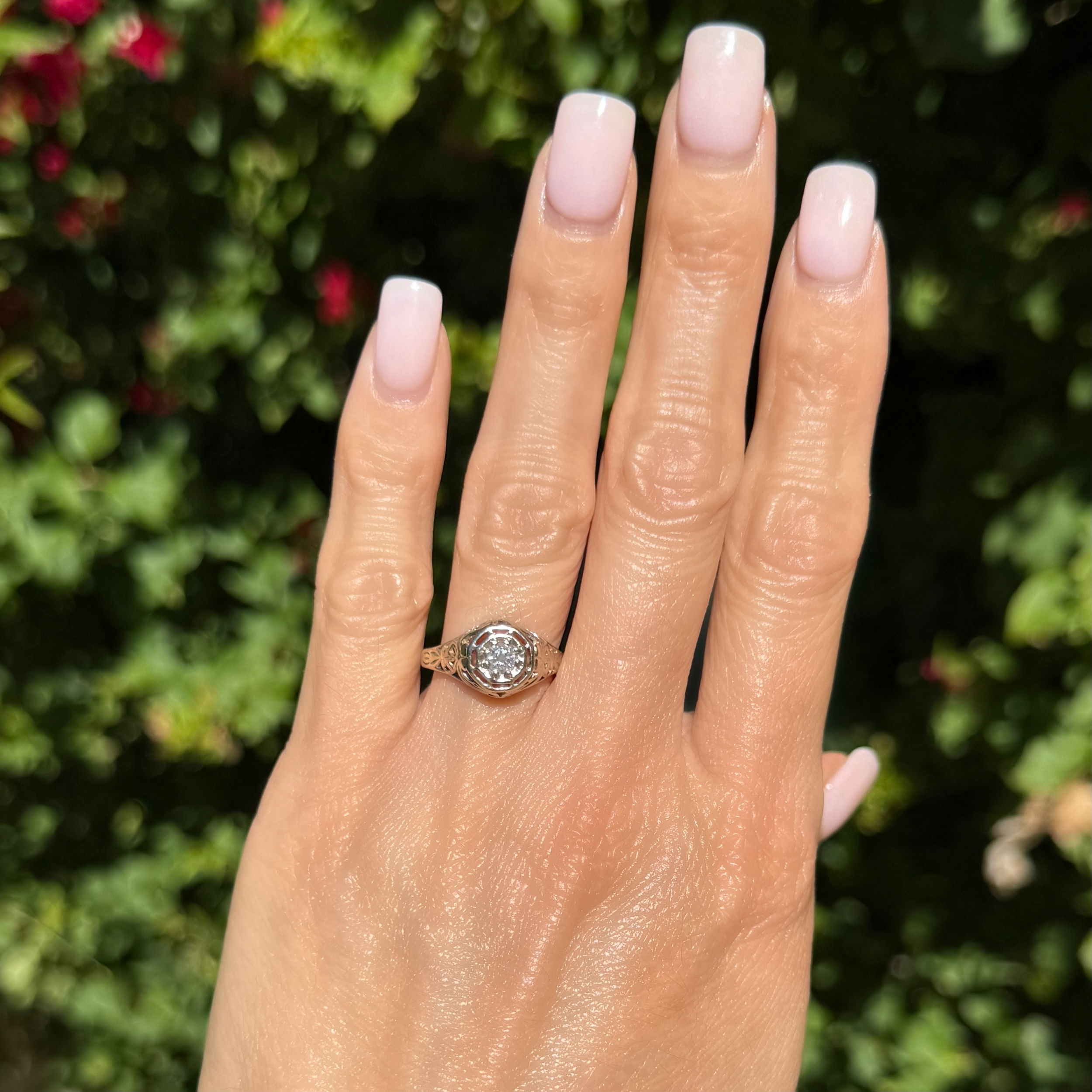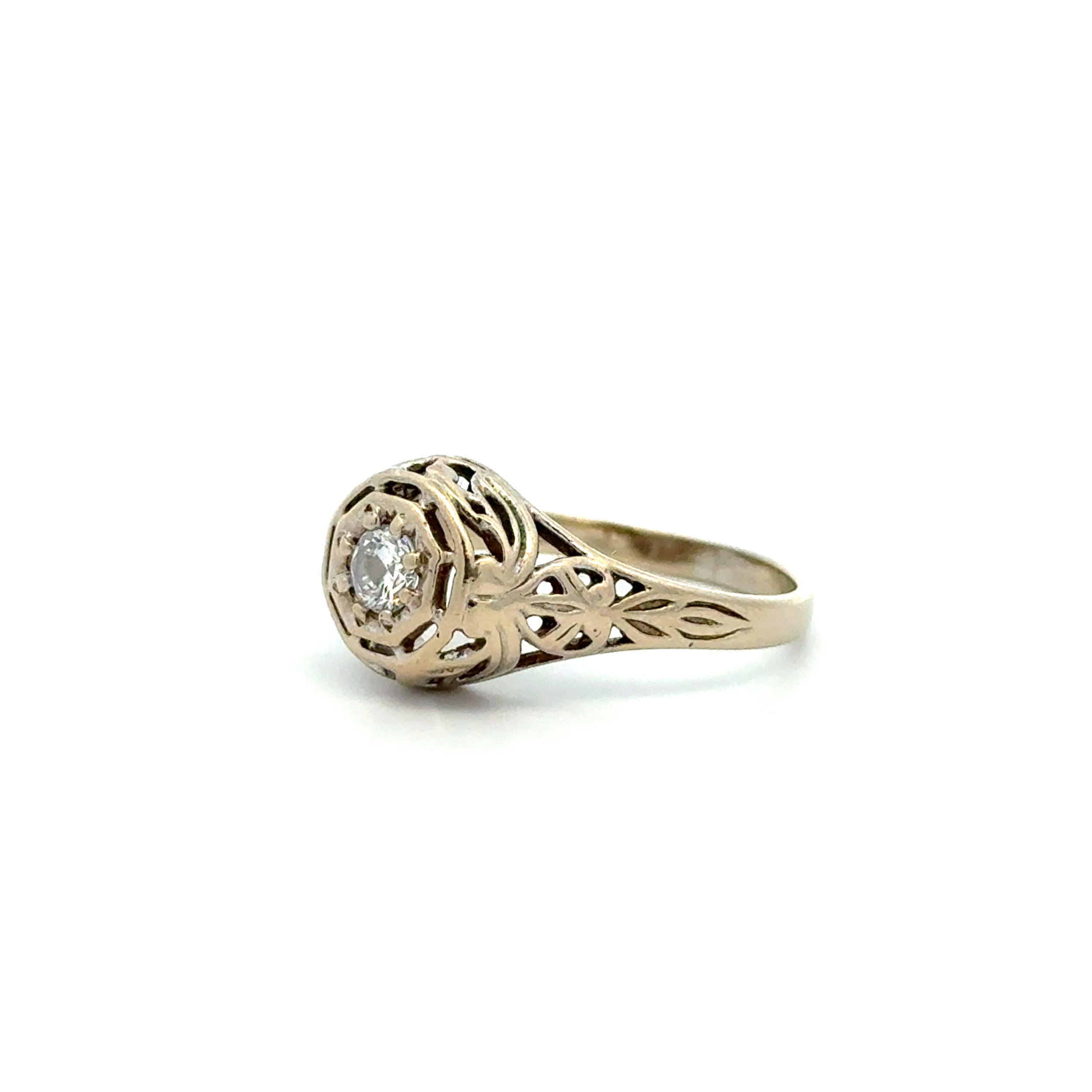 14K WG Art Deco .25ctOEC Diamond Filigree Ring 3.3g, s7.5
