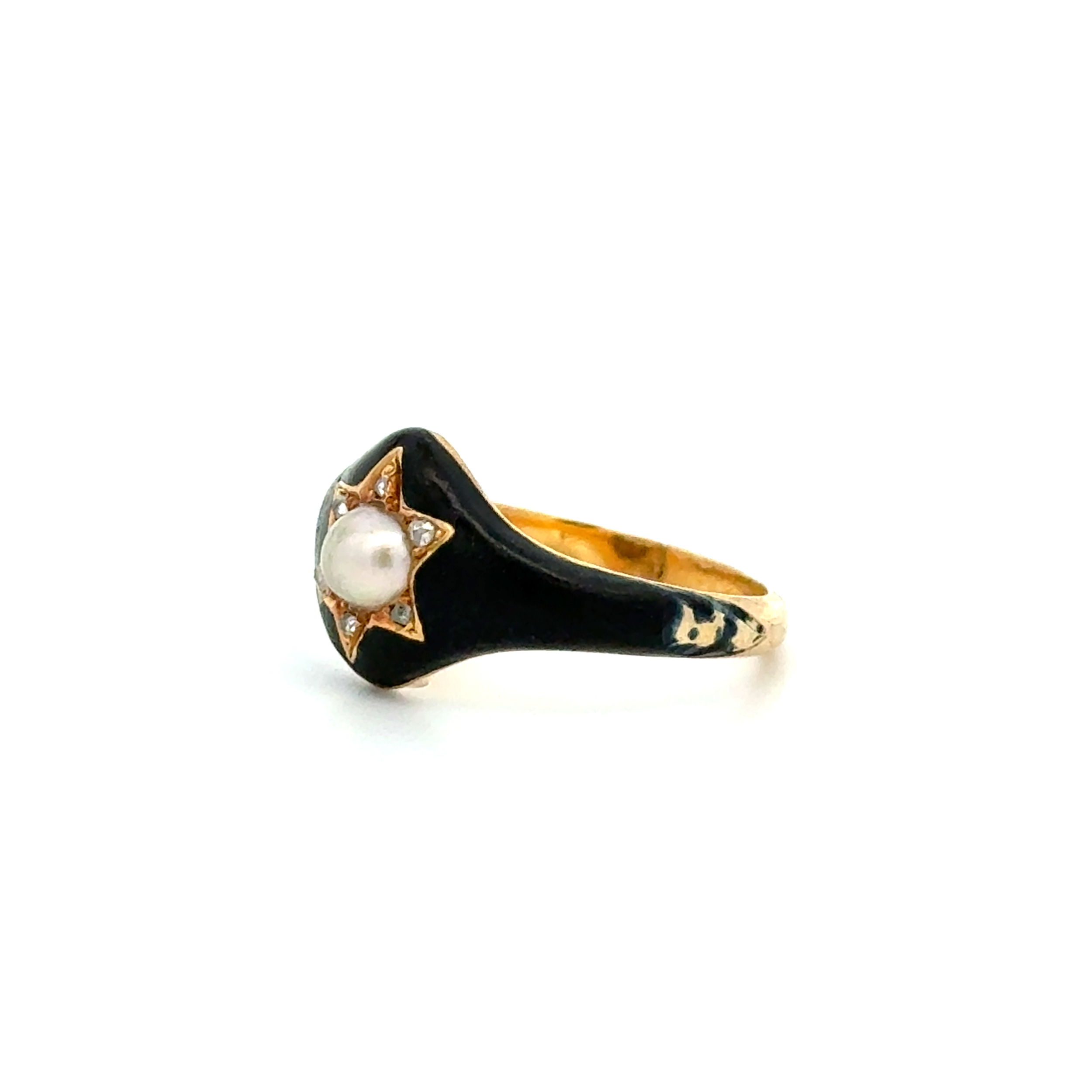 18K YG Victorian Pearl, Black Enamel & .04tcw Diamond Ring 3.0g, s5.5