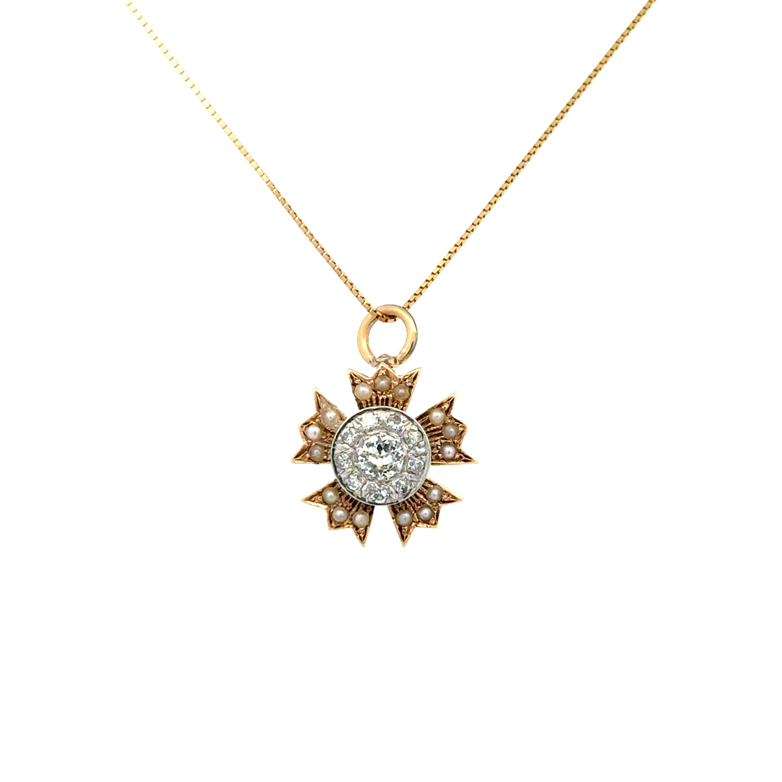 14K YG Victorian .37tcw OEC Diamond & Seed Pearl Five Petal Flower Pendant Necklace 5.2g, | Platinum 1911