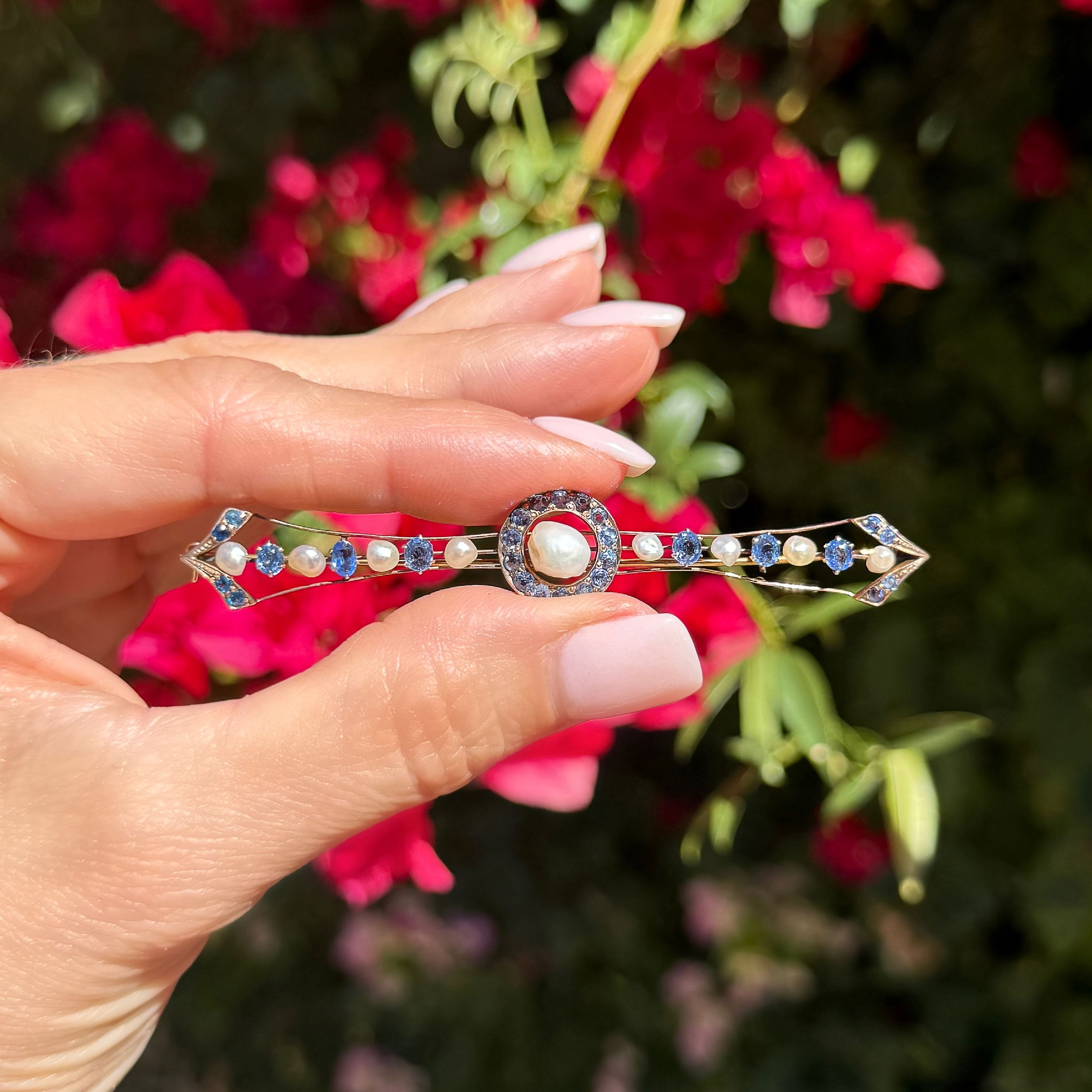 9K RG Victorian Natural Pearl & 2.75tcw Natural Sapphire Long Brooch 5.5g, 3.30"