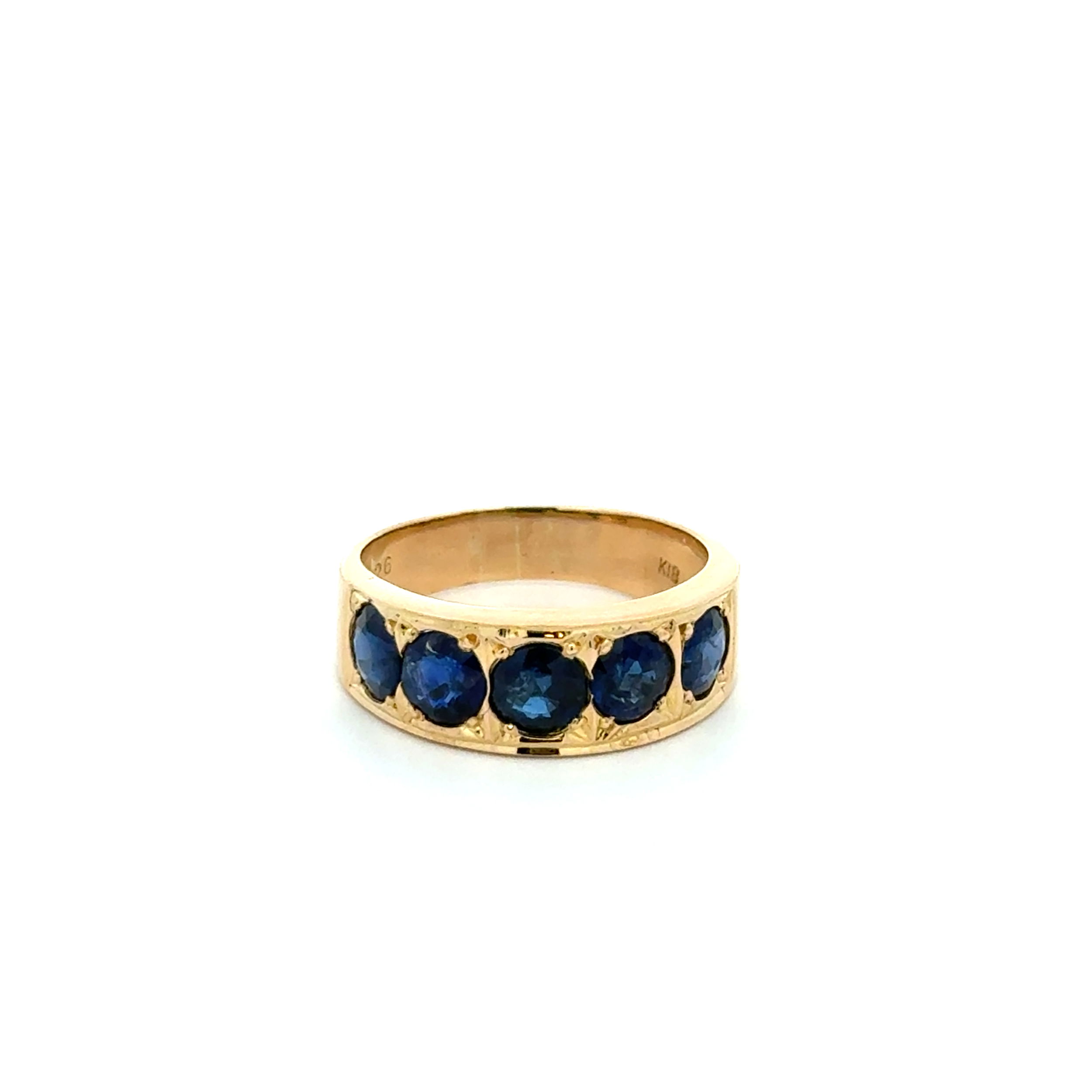 18K YG Vintage 2.26tcw 5 Sapphire 7mm Band Ring 4.3g, s6